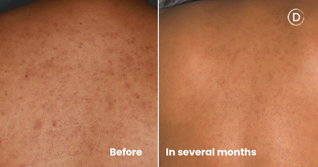 This before-and-after demonstrates improvement in back acne and post-inflammatory hyperpigmentation following a personalized dermatologic treatment plan.