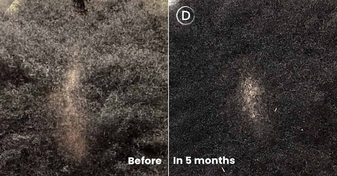 Central centrifugal cicatricial alopecia (CCCA) disproportionately affects Afro-American patients. Among male individuals, it’s frequently misdiagnosed as pattern hair loss when biopsies aren’t conducted. Proper diagnosis, confirmed through biopsy in this case, led to the initiation of anti-inflammatory medications and injections. Additionally, adopting natural hairstyles without braiding played a significant role in mitigating this challenging hair loss condition within just a few months.