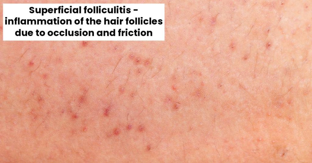 Folliculitis occurs when the hair follicles become swollen and irritated, usually caused by infections or friction from shaving. It typically presents as small, red bumps or pustules around the hair follicles and can be confused with acne on the buttocks.