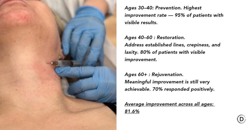 A published case series in Clinical, Cosmetic and Investigational Dermatology examined Radiesse for the neck, décolletage, and face across three distinct patient groups — those in their 30s and 40s, those between 40 and 60, and patients over 60. The results were clear: visible improvement was seen in 95% of younger patients, 80% of middle-aged patients, and 70% of older patients, with an average improvement of 81.6% across all groups.