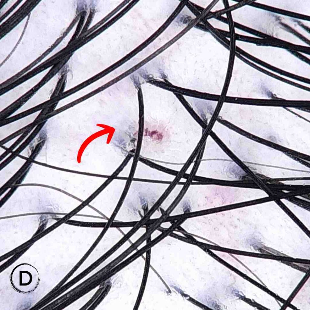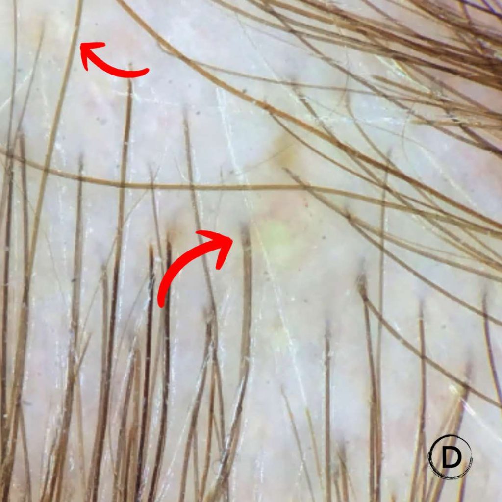 Scalp Folliculitis: This patient, with a history of long-standing pattern hair loss, experienced severe itching. Treatment with topical antibiotics has been initiated to address the condition. Trichoscopy photographs demonstrating yellow pus-containing elements.